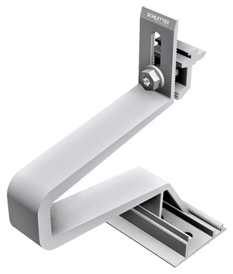Der Dachhaken Rapid-A 45 Pro Max von Hersteller Schletter ist aus Aluminium und damit rund 70 Prozent leichter als vergleichbare Dachhaken aus Stahl. Er deckt einen Großteil der Anwendungen auf Ziegeldächern ab und ist für höhere Schneelasten und Windlasten geeignet.