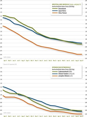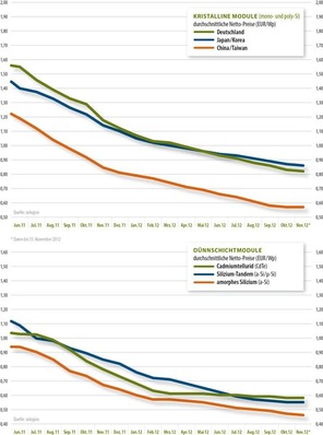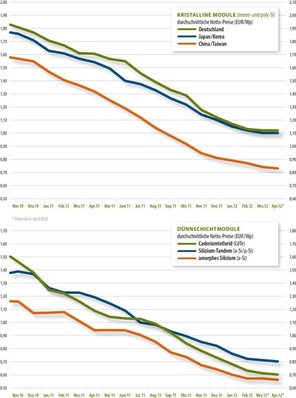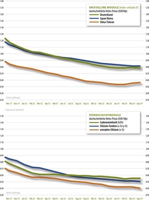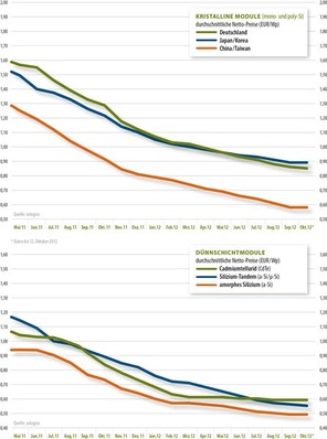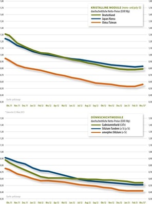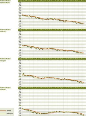 Modulpreise: Der Preisindex erlebte im vergangenen Monat eine Premiere. Kristalline Module aus Deutschland waren billiger als die Konkurrenzprodukte aus Japan.