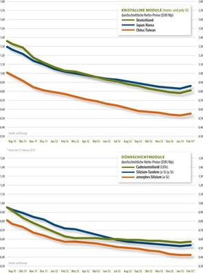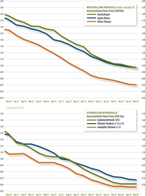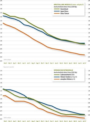 Modulpreise: Die Preise für kristalline Module sind weiter gesunken. Den stärksten Rückgang verzeichnet jedoch die Dünnschicht-Kategorie a-Si/µ-Si.