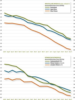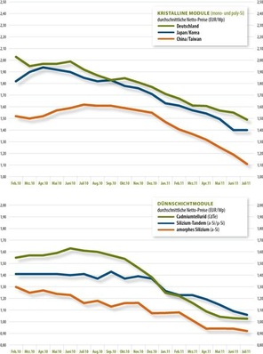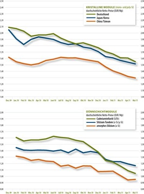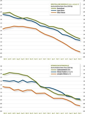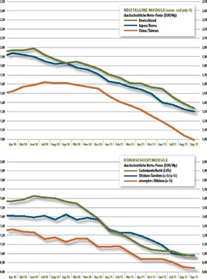 Modulpreise: Um bis zu 45 Prozent sind die Modulpreise im Jahr 2011 gesunken. Vor allem chinesische Hersteller haben ihren Kunden kräftige Nachlässe gewährt.