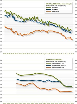 Modulpreise: Mit neuen Preissenkungen im März verabschiedet sich der Spotmarkt aus dem ersten Quartal 2011. Die anhaltende Unsicherheit vieler Investoren führte jedoch allgemein zu einer schwachen Nachfrage.