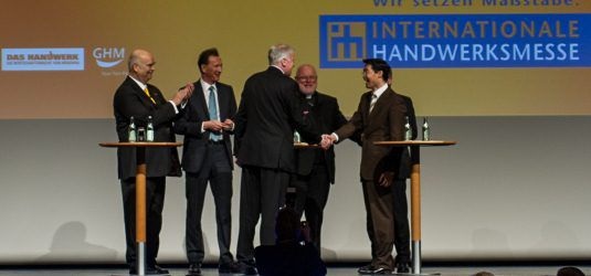 Per Handschlag sichert der bayerische Ministerpräsident seine Unterstützung für ein Planungsbeschleunigungsgesetz der Energiewende zu. Auf der Eröffnungsveranstaltung wird die Bedeutung des Handwerks für die Umsetzung der Energiewende betont.