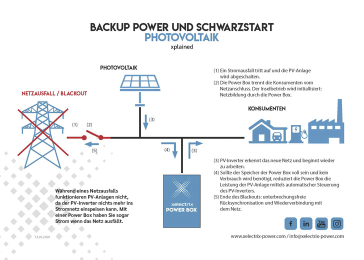 Bei Netzausfall trennt die Xelectrix Power Box automatisch die Verbraucher vom öffentlichen Netzanschluss und schaltet in Inselbetrieb. Die Solarinverter erkennen das neue Netz, nehmen die Stromerzeugung wieder auf und übernehmen eine fortlaufende Versorgung des Gebäudes.