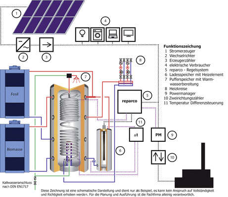 Den überschüssigen Solarstrom greift er nicht am Wechselrichter ab, sondern direkt am Einspeisezähler oder am Zweirichtungszähler der Anlage mit Eigenverbrauch. „Auf diese Weise ist das Reparco-System sehr unabhängig vom Generator“, erläutert Baier. „Wir bauen es auch in Anlagen mit BHKW, Kleinwindkraft oder Wasserkraft ein. Unser Powermanager sitzt am Zähler des EVU. Wenn am Zähler Überschüsse anliegen, ergeht ein Signal an das Regelsystem, um die Energie über den Heizstab abzunehmen und ins Warmwasser zu schicken.“