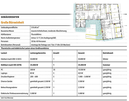 Bei folgendem Beispiel handelt es sich um ein Großraumbüro auf einer Fläche von etwa 500 Quadratmetern für insgesamt 40 Mitarbeiter. Das Gebäude wurde 2011 baulich und energetisch saniert. Bei den Planungen stellte sich heraus, dass aufgrund der Bauart und der Ausrichtung ein sehr hoher Energieaufwand für die Kühlung der Büroräume notwendig wird. Die gesamte Kühllast beträgt 35.846 Watt. Sie ist deutlich höher als die Heizlast mit 30.890 Watt. Bezogen ist diese Kühllast auf den heißesten Tag im Sommer (33 Grad Celsius), an dem die Räume nicht wärmer als 26 Grad Celsius sein dürfen.