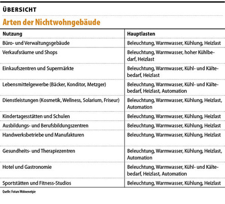 Die Eigenversorgung von privaten, gewerblichen, kommunalen oder industriellen Nichtwohngebäuden ist viel komplexer und differenzierter als bei Wohngebäuden. Allein der Begriff „Nichtwohngebäude“ bezeichnet ungleich mehr Gebäudearten. Bauformen und Bauarten sind vielfältig und sehr verschieden, da sie architektonisch den Zweckbauten zuzuordnen sind. Aber in ihrer Nutzung unterscheiden sich Nichtwohngebäude von den Wohngebäuden mitunter sehr stark. Eines der wichtigsten Unterscheidungsmerkmale ist die Belegung und Auslastung der Räume und Gebäude durch Personen. In der Regel halten sich Menschen nur tagsüber in Nichtwohngebäuden auf.
