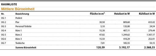 Ein anderes Beispiel ist eine mittlere Büroeinheit mit rund 120 Quadratmetern für acht Mitarbeiter. Es wurde baulich und energetisch saniert, die Büroeinheit als Neubau aufgestockt. Im Erdgeschoss befinden sich ein Beratungszentrum und eine Musterwohnung. Die Heizlast beträgt für diese Büroeinheit 3.192,17 Watt und die Kühllast etwa 2.568,33 Watt. Das Verhältnis beider Lasten lautet: Kühllast 21,42 Watt pro Quadratmeter und Heizlast 26,47 Watt pro Quadratmeter. Dieses Büro unterscheidet sich nicht nur in der Größe und den Lastdifferenzen, sondern auch in der Bauart und Ausstattung mit Technik vom Großraumbüro. Dennoch sind beide Büroeinheiten sehr gut vergleichbar, sowohl von den Klimadaten (außer Außentemperatur) als auch von der Bauart. Bei beiden Gebäuden gibt es ein direkt darüber liegendes Flachdach mit der entsprechenden Fläche zum Grundriss.