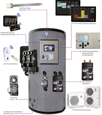 PV-Heiz Q-Hybrid Solo ist ein Komplettsystem, das der Installateur vorkonfektioniert und anschlussfertig geliefert bekommt. Neben der Photovoltaikanlage gehören dazu der Energiemanager, die Wärmepumpe und der integrierte Heizstab für die schnelle Aufheizung des Pufferspeichers. Zunächst wird der Sonnenstrom direkt an verbrauchsintensive Geräte im Haus geliefert, die mit Funksteckdosen angesteuert werden. Liefert die Anlage auf dem Dach mehr Energie, wird mit dem Überschuss zuerst die Wärmepumpe betrieben. Weitere Überschüsse lassen sich mittels Heizstab in Wärme wandeln. Auf diese Weise sind hohe Temperaturen bis 90 Grad Celsius möglich.