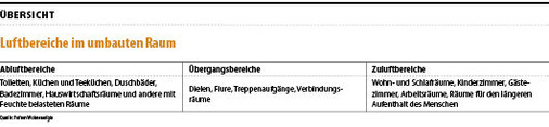 Die zentrale Norm für die Lüftung von Wohngebäuden ist die DIN 1946-6, welche die Auslegung und Planung, Installation, Inbetriebnahme und Instandhaltung regelt. Das Beiblatt 2 zeigt die systematische Struktur zur Erstellung eines Lüftungskonzepts. Hier gilt es, zwischen den Luftbereichen zu unterscheiden, wie in der Tabelle auf der folgenden Seite dargestellt ist.