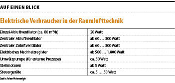 Die wichtigsten elektrischen Verbraucher in der Raumlufttechnik sind zweifelsfrei die Ventilatoren bezüglich der elektrischen Leistungsaufnahme, die quasi konstant benötigt wird. Die Leistungsaufnahmen beginnen bei Einzelraum-Abluftventilatoren bei etwa 20 Watt. Bei kompakten Wohnungslüftungsanlagen reichen sie bis zu zweimal 250 Watt. Die Steuereinheiten bestehen aus einfachen Reglern mit Zeitschaltautomatik (Tag- und Wochenschaltung) und einer Drei-Stufen-Steuerung für den Ventilator. Die drei geläufigen Stufen sind: Grundlüftung, reduzierte Lüftung und Normlüftung. Die Auslegung der Lüftungsanlage erfolgt für die Normlüftung als maximale Lüftungsleistung. Bei niedrigerem Bedarf wird die Ventilatorleistung in Stufen reduziert.