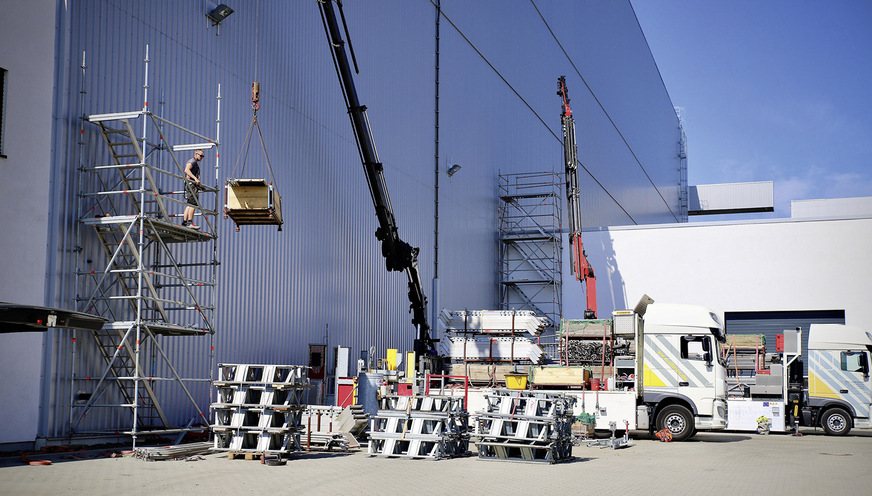 Die Fassade ist eine Kassettenwand mit Trapezverkleidung. Mithilfe von Rohren gelang die Befestigung des Aufzugturms an der unter den Kassetten liegenden Stahlkonstruktion. Ein zweiter Treppenturm, der zu einer niedrigeren, zweiten Dachfläche führt, diente als Arbeitsgerüst zur Installation des Kabelkanals der Solaranlage zum Boden. Sowohl die Richtlinien für den Arbeitsschutz als auch die Anforderungen an Planung und Technik wurden umfassend erfüllt – bei erheblicher Zeit- und Kostenersparnis.