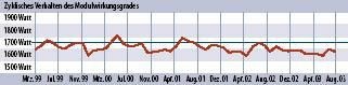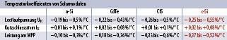 Eine Berechnung des Temperaturverhaltens unterschiedlicher Modultechnolgien anhand der Koeffizienten zeigt, dass die Leistungseinbußen der Dünnschicht- Solarmodule aus amorphem Silizium (a-Si), Cadmium-Tellurid (CdTe) und Kupfer-Indium-Diselenid (CIS) bei höheren Temperaturen geringer sind als die von mono- oder polykristallinen Zellen.