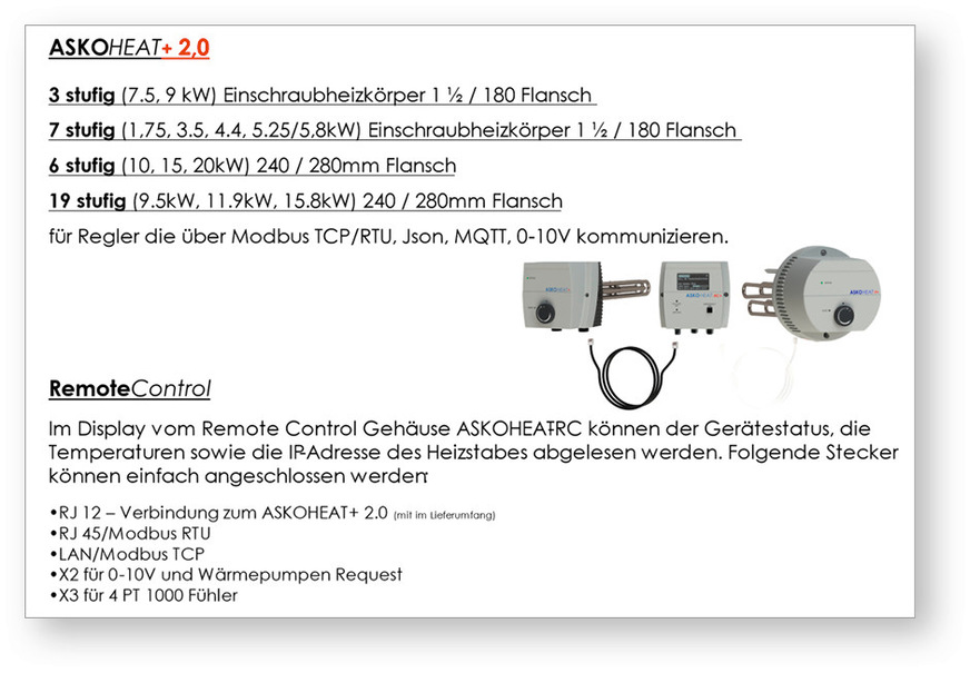 Der Asko Heat plus beispielsweise ist eine Baureihe von Einschraubheizkörpern verschiedener Leistungen, stufenlos oder mehrstufig regelbar. Sie sind für die einfache und direkte Montage in Hygiene-, Heizungspuffer- oder Trinkwasserspeicher konzipiert.