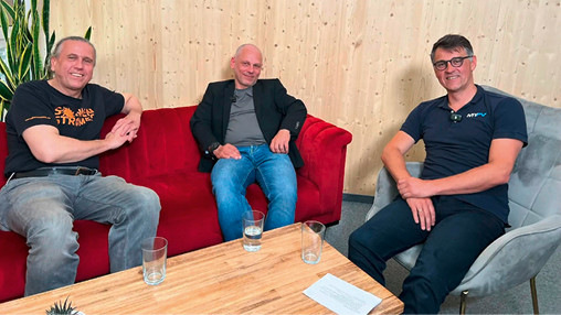 Sven Ulllrich (Mitte) und Heiko Schwarzburger (links) aus der Redaktion der photovoltaik haben sich im Expertengespräch mit Markus Gundendorfer von My-PV über Trends der Energiewende im Wärmesektor ausgetauscht.
