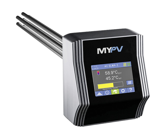 Der neue Heizstab mit 3,5 Kilowatt Leistung ist zudem stufenlos regelbar. Weil das Gerät zusätzlich einen externen Standardheizstab mit drei Kilowatt ansteuern kann, lassen sich in Summe Leistungen von bis zu 6,5 Kilowatt realisieren. Das Gerät verwendet überschüssigen Solarstrom, dadurch wird der Eigenverbrauch von etwa 30 Prozent auf bis zu 75 Prozent erhöht. My-PV hat den Heizstab erstmals Ende 2022 auf einem Online-Event präsentiert.