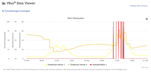 Einstellungen der Visualisierung werden bei www.vbus.net mit wenigen Klicks gesichert und können ebenso wiederhergestellt werden. So lässt sich viel Zeit beim Konfigurieren weiterer Benutzerkonten einsparen, indem einmal gemachte Einstellungen einfach weitergegeben werden. Ein weiteres Feature ist der integrierte Data Viewer. Dieses Plug-in erlaubt die Nutzung von Diagrammfunktionen für extern gespeicherte Datensätze.