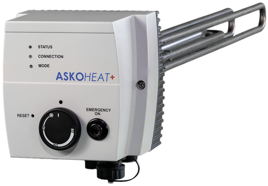 Der Zweirichtungszähler steuert den elektrischen Wärmeerzeuger. Er kann aber auch in ein bestehendes Energiemanagement order eine Gebäudeautomatisierungssteuerung integriert werden, wenn diese ohnehin schon vorhanden ist. Über einen potenzialfreien Eingang arbeitet der Askoheat auch mit Wärmepumpen zusammen.