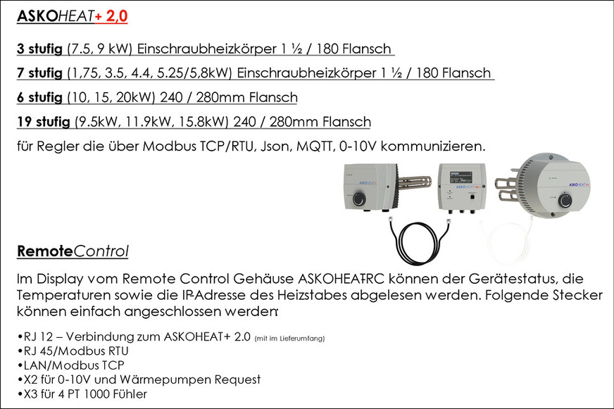 Der Schweizer Anbieter Askoma bietet Produkte, um Sonnenstrom für Warmwasser und Heizwärme zu nutzen. Der Asko Heat plus beispielsweise ist eine Baureihe von Einschraubheizkörpern verschiedener Leistungen, die stufenlos oder mehrstufig regelbar sind.
