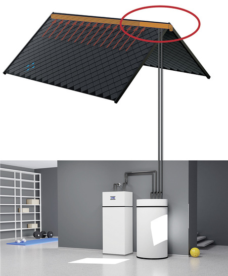 Nun haben die Ingenieure den Wärmetauscher unsichtbar ins Dach integriert. Dieser fungiert als Wärmequelle für eine Sole-Wärmepumpe. Die Wärmepumpe erhält die Wärme nunmehr von oben statt von unten. Somit entfallen teure Bohrungen ins Erdreich – die übrigens nicht überall zugelassen werden. Nicht nur das: Die Sole bringt meist eine Wärme von zehn bis 14 Grad Celsius aus dem Erdreich hoch. Das Solardach liefert hingegen selbst bei Minusgraden bis zu 30 Grad Celsius an die Wärmepumpe.