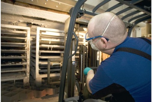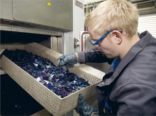 Auf alle Fälle entfernt werden die Kabel und Anschlussdosen. Dann geht es ab in die Brennkammer Per Gabelstapler werden die „blanken“ Module auf mehrlagigen Gestellen in den gasbetriebenen Ofen gehievt. Dort werden sie über mehrere Stunden auf circa 500 Grad Celsius erhitzt „Die Verbundkunststoffe werden verbrannt. „Zurück bleiben das Glas, die Rahmen, die metallischen Verbin der, Solarzellen und Füllstoffe“, erklärt Schlenker. Besonders begehrt sind die noch weitgehend intakten Zellen, die behutsam entnommen werden. Sie sind in Dutzenden Styroporboxen abgelegt, sortiert nach unterschiedlicher Qualität und Färbung. Sie können nach mehreren Reinigungsschritten direkt wieder als Wafer verwendet werden, aus denen dann neue Solarzellen und Module gefertigt werden.
