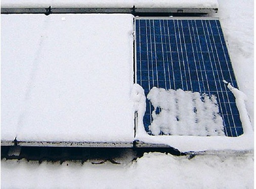 Ist das aber nicht eine gigantische Energieverschwendung? Strom, der zu Heizzwe-cken missbraucht wird? Im Widerspruch zum elften Gebot der Effizienzgesetze: Du sollst aus Strom keine Wärme machen! Doch eine Diplomarbeit der FH Darmstadt kommt zu dem Ergebnis, dass das keineswegs der Fall ist. Im Versuch legten die Darmstädter eine Wärmeleistung von rund 90 Prozent der Nennleistung an ein Referenzmodul an. Bereits nach einer Viertelstunde war eine große Menge des Schnees abgetaut. Nach sechs Stunden war das Referenzmodul komplett schneefrei. Die bisherigen Untersuchungen zeigen, dass nur vier sonnige Wintertage genügen, um die für die Modulheizung verbrauchte Energie wieder zu erzeugen. Besser noch wäre es allerdings, wenn man dafür sorgen würde, dass der Schnee gar nicht erst auf dem Modul liegen bleibt.