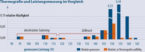 Bisher empfehlen die Thermografen die auffälligen Module dem jeweiligen Installateur zur weiteren Beurteilung. Wenn das, wie bei großen Solarparks, zu aufwändig ist, lassen sich die Lieferanten auch auf pauschale Absprachen ein. „Unser Vorschlag ist, dass es einen Modultausch ab einer Differenz von zehn Grad gibt. Das wird von den meisten Modulherstellern auch akzeptiert“, sagt Faltermeier von Meteocontrol. Eine thermische Auffälligkeit schlägt sich aber nicht immer sofort in der Leistungsmessung nieder. Zellbrüche können zu Beginn wenig Probleme machen, im Laufe der Jahre aber schlimmer werden. Deshalb werden kleinere Fehler zur Beobachtung vorgemerkt. In Buerhops Untersuchung traten bei Zellbrüchen Überhitzungen von 2,5 bis 45 Grad auf. „Man kann den Umtausch nicht von einem bestimmten Temperatursprung abhängig machen“, gibt sie zu bedenken. Es komme immer auf die Art des Fehlers und die Messbedingungen an.