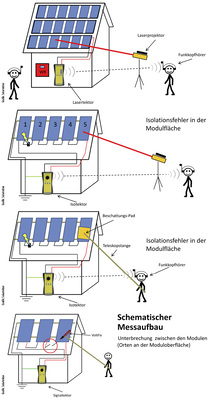 Das Prinzip ist sehr einfach zu verstehen: Solartektor nutzt einen blauen Laser, um die Solarzellen im Modul zu aktivieren. Damit lassen sich Solargeneratoren auch bei Bewölkung oder nachts ausmessen, sogar bei dünner Schneedecke oder Reif auf den Modulen. Weitere Geräte zur Fehlersuche runden das System ab. Das Fehlerortungs-Set LSI vereint drei Komponenten: