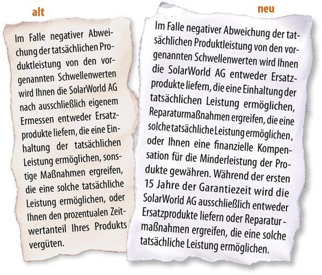 Dieser Druck zeigt Wirkung: Solarworld und Bosch Solar haben laut Verbraucherzentrale NRW vollständige Unterlassungserklärungen abgegeben, die auch die besonders kritisierte Frage der Kostenverteilung umfasst. Kunden dieser beiden Unternehmen werden also künftig nicht mehr auf ihren Ausgaben sitzen bleiben, sofern ein Garantiefallvorliegt. „Den Passus ‚Die Kosten für Demontage, Prüfung, Entsorgung, Transport, Montage und Neuinstallation der Module oder einzelner Bestandteile dieser Module im Rahmen der freiwilligen Garantieleistung trägt der Endkunde’ haben wir ersatzlos gestrichen“, sagt Bosch-Solar-Sprecherin Heide Traemann. Zudem biete das Unternehmen jetzt auch an, im Garantiefall neben dem Austausch oder der Reparatur des Moduls alternativ auch den entgangenen Ertrag zu ersetzen. Die Klauseln gelten ab Juli 2011. „Die neuen Bedingungen wenden wir aber selbstverständlich auch bei Bosch-Modulen an, die wir vor Juli 2011 ausgeliefert haben“, erklärt Traemann.