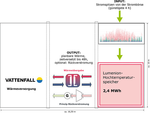 Dieses bestehende System soll nun um ein innovatives Speicher-BHKW von Lumenion ergänzt werden. Im ersten Jahr sei zunächst nur eine Wärmelieferung aus dem Speicher geplant. In der zweiten Ausbaustufe ab November 2019 soll eine Dampfturbine die Wärme auch wieder rückverstromen. Je nach Turbine liegt der Wirkungsgrad bei bis zu 35 Prozent. Vorteil der Technologie: Durch die hohe Energiedichte, die zehn Mal höher ist als die von Wasser, kann der vorhandene Kellerraum effizienter genutzt werden. Und Stahl sei länger haltbar als Lithiumakkus und mindestens um den Faktor zehn günstiger. Der Speicher könnte laut Lumenion Stromspitzen für weniger als zwei Cent pro Kilowattstunde puffern.