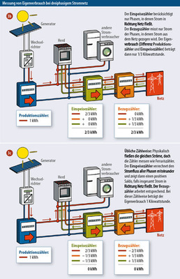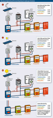 Spielt man die drei möglichen Betriebsfälle Eigenverbrauch, Einspeisung und Bezug für ein einphasig betriebenes Hausnetz durch, so ergeben sich die in der Grafik dargestellten Zählerstände. Bei reinem Eigenverbrauch (Situation 3a), zum Beispiel mittags, wenn gekocht wird, messen die Zähler zwei und drei keine Leistungsflüsse, da die gesamte Leistung direkt an die Haushaltslasten abgegeben wird und kein Austausch mit dem Netz erfolgt. Der Eigenverbrauch ergibt sich somit aus der Differenz aus den Zählerständen eins und zwei. Das gilt auch für die anderen beiden Betriebsfälle. Einspeisung und Bezug können dabei direkt abgelesen werden. Das gilt auch, wenn die Betriebszustände gemischt auftreten, wenn also zur Einspeisung ein kleinerer Anteil Eigenverbrauch dazukommt oder der Verbrauch zu einem Teil von Netzstrom, zu einem anderen Teil von Solarstrom gespeist wird.