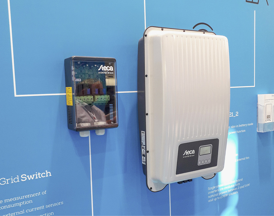 Steca aus Memmingen zeigte zur Intersolar den neuen dreiphasigen Hybridwechselrichter Steca Grid Hybrid 10023_3 mit zehn Kilowatt AC-Leistung, die auch im Batteriebetrieb erreicht werden. Er erreicht einen maximalen Wirkungsgrad von über 98 Prozent und zeigt gutes Betriebsverhalten bei Teillast. Zwei MPP-Tracker erleichtern die Anlagenauslegung.