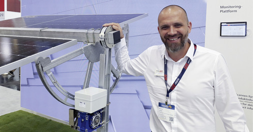 Das kommt deutlich bei uns an, die Nachfrage ist hoch. Deshalb präsentieren wir in diesem Jahr ein Nachführsystem speziell für landwirtschaftliche Flächen. Die Module können auf fünf Meter Höhe aufgeständert werden. Mit dem neuen Tracker lassen sich landwirtschaftliche Restflächen für Solargeneratoren auf sehr einfache Weise erschließen. Auf jedes Trackermodul passen acht Module, man kann die Systeme auch auf hügeligem Terrain aufstellen. Der Tracker erkennt beispielsweise, ob Schnee auf den Modulen liegt. Dann stellt er die Module vertikal, um den Schnee abzuwerfen. Mit dem Tracker ist das System nicht teurer als eine normale Anlage.