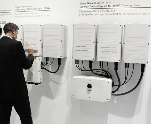 Die neuen Synergy-Geräte, die gewerbliche Baureihe des Anbieters, reichen bereits bis 100 Kilowatt. Sie sind zweigeteilt: Die Primäreinheit umfasst alle DC- und AC-Anschlüsse. Je nach Leistung des Solarfeldes werden mehrere Sekundäreinheiten mit den Leistungsteilen aufgeschaltet. Auf diese Weise lassen sich Leistungen von 100 bis 300 Kilowatt abdecken. In Aussicht gestellt wurde ein Gerät der nächsten Generation für 120 Kilowatt.
